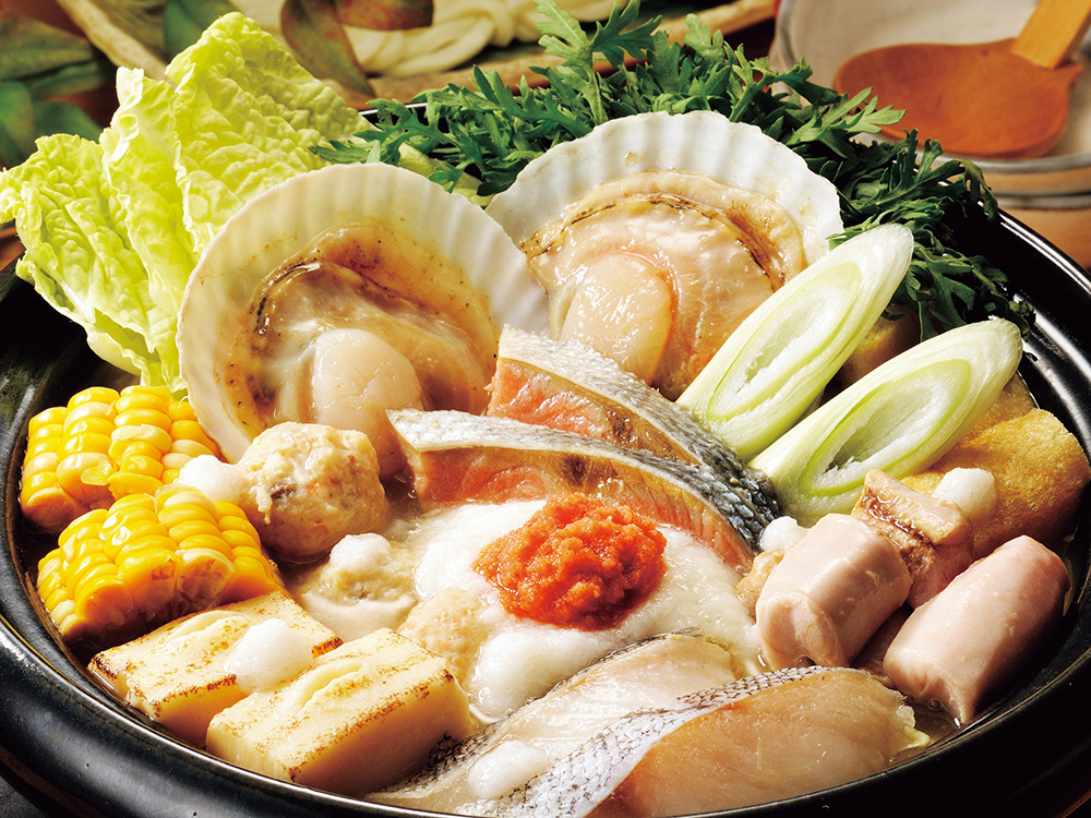山芋を雪に見立てた「雪見鍋」。北海道産の魚介と酒粕入りのスープ。