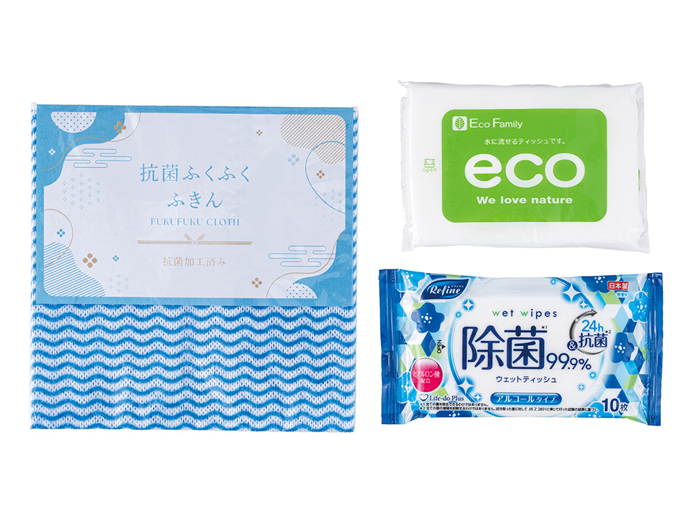 日常生活に欠かせない消耗品5点を詰めた「紅富士福箱」。華やかな見た目で販促イベントの目玉に最適です。特典としても、お客様に喜ばれるおめでたい一品です。