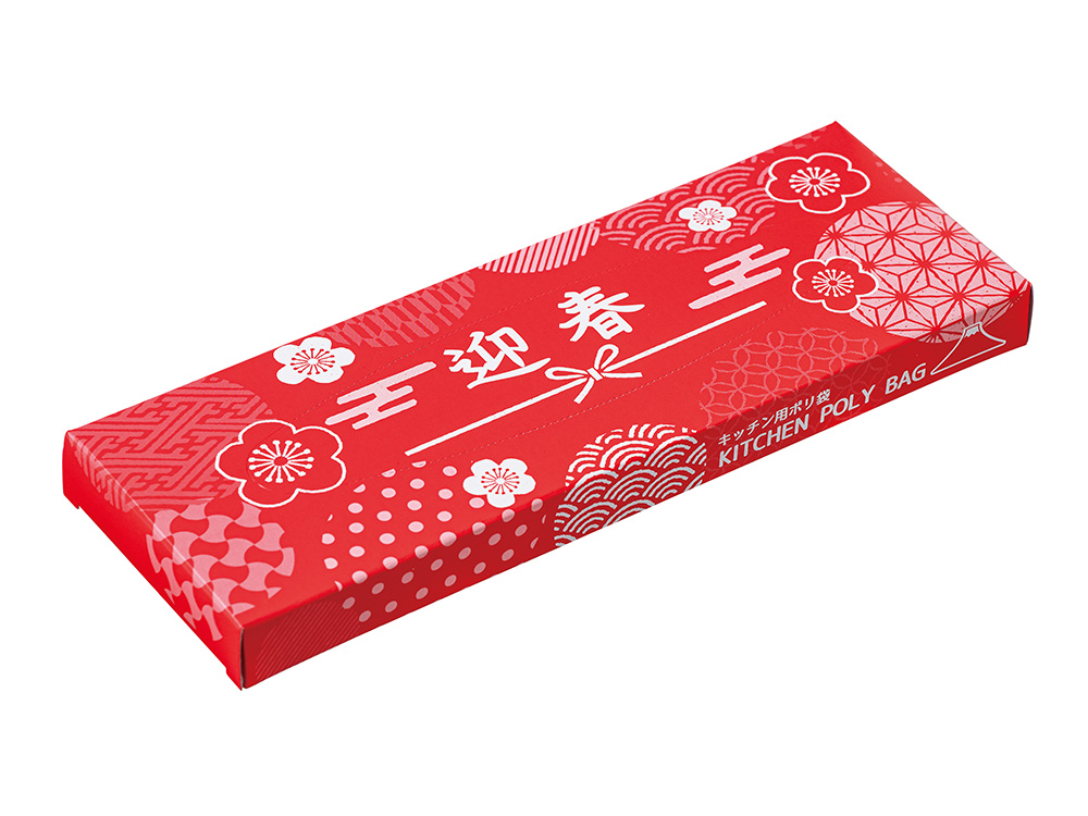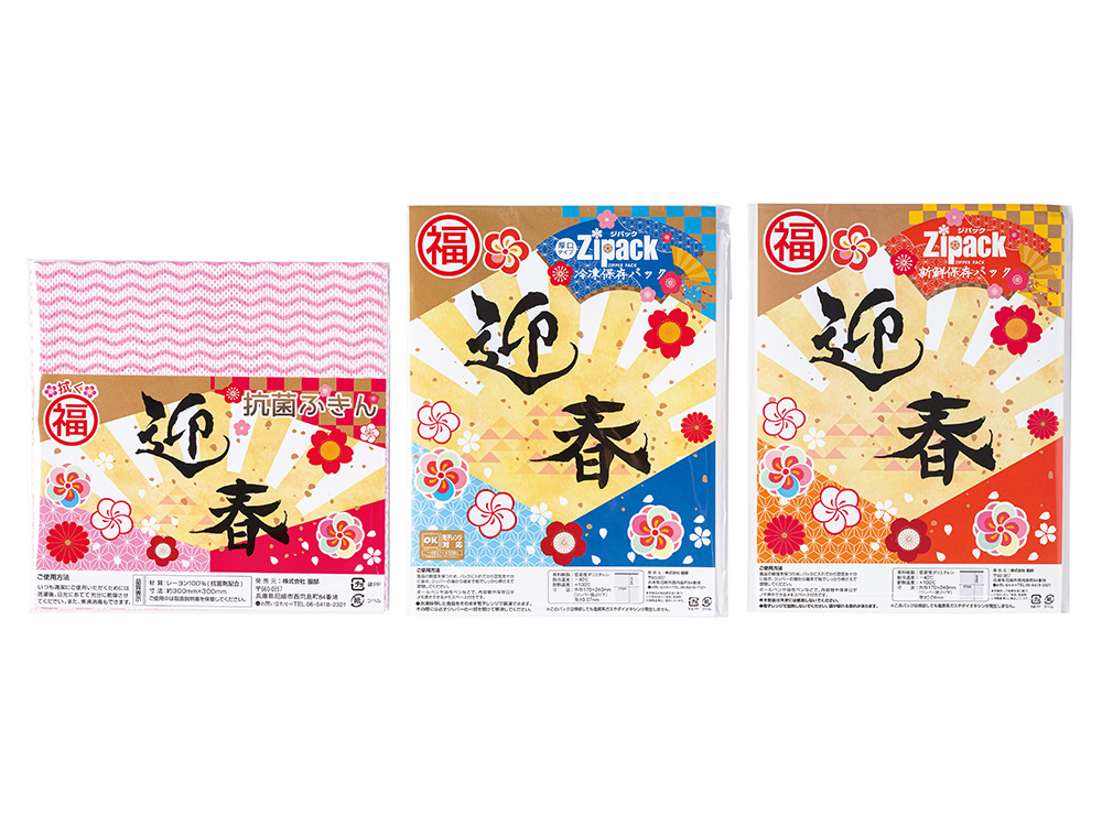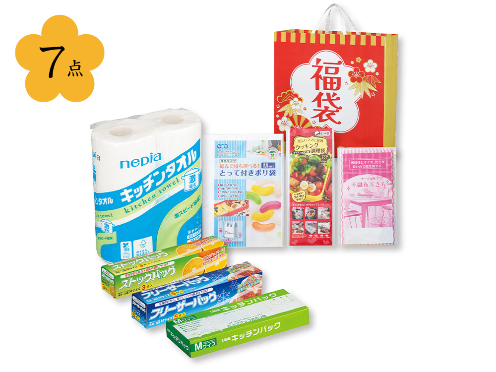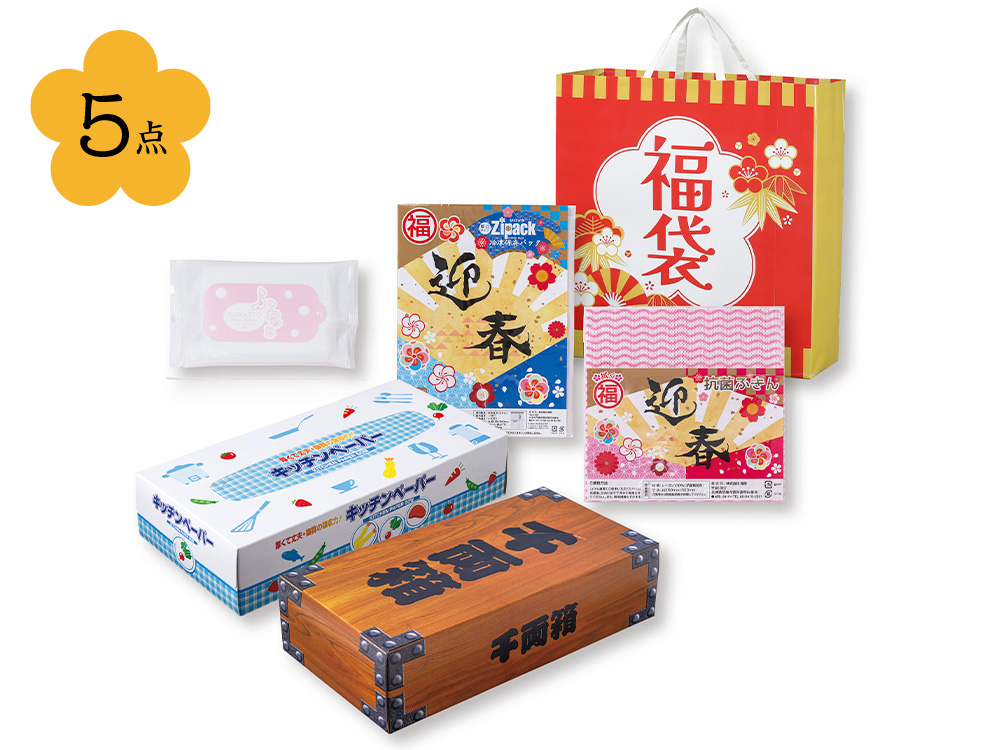 縁起の良い柄の袋に入ったキッチン日用品の福袋です。