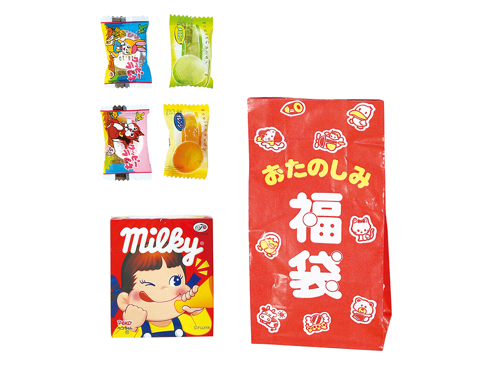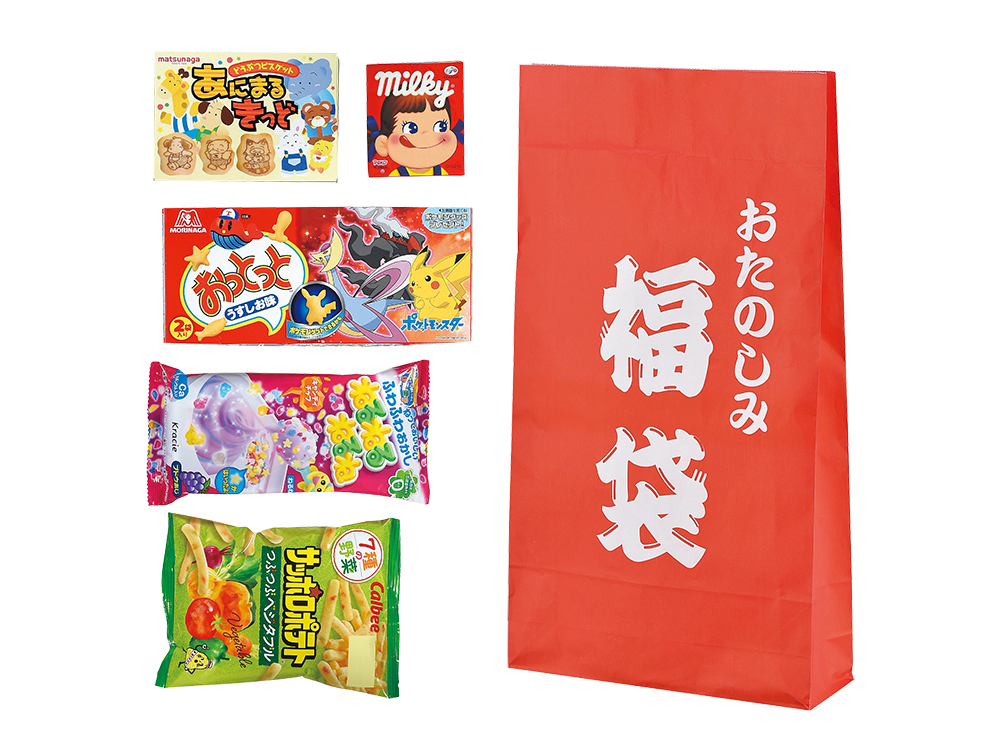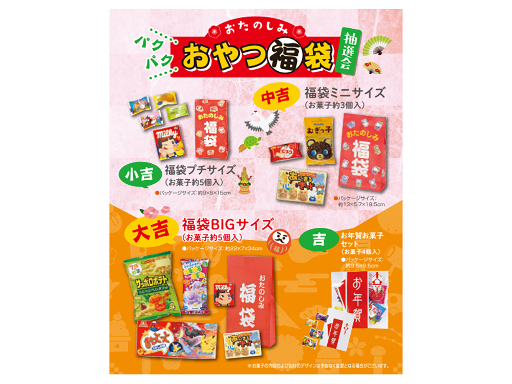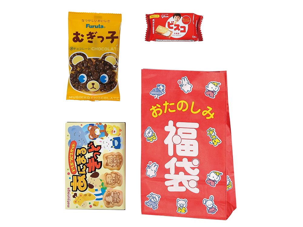 袋の中身はお楽しみ!子どもも大人もワクワクするお菓子福袋の抽選会キットです。