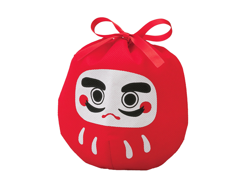 おめでたくてかわいい!不織布製のだるま巾着。お菓子が3個入っています。