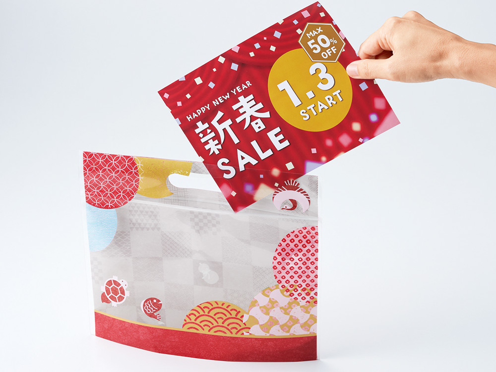 正面クリア素材で中身がひと目で分かる福袋。名刺やチラシも入れやすく、売りやブースを華やかに彩ります。マチ付きなので自立するのもポイント。