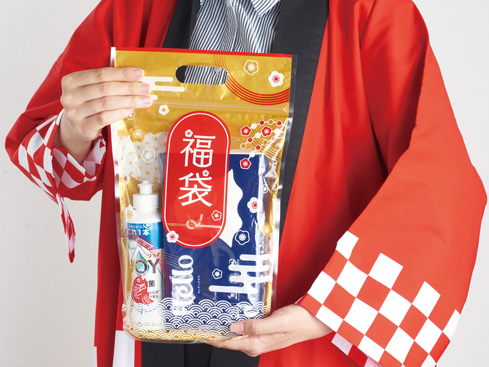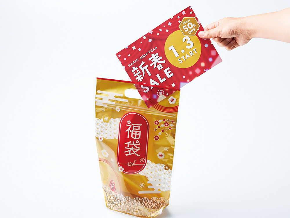 おめで鯛パッケージ入で映える福袋。名刺やチラシも入れやすく、売りやブースを華やかに彩ります。マチ付きなので自立するのもポイント。