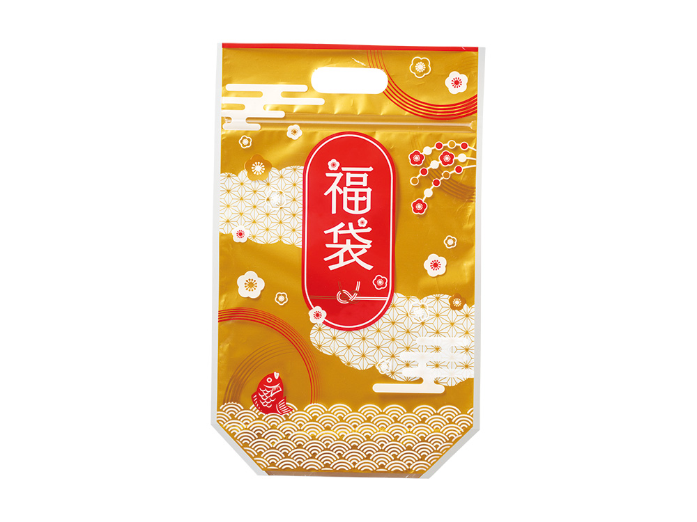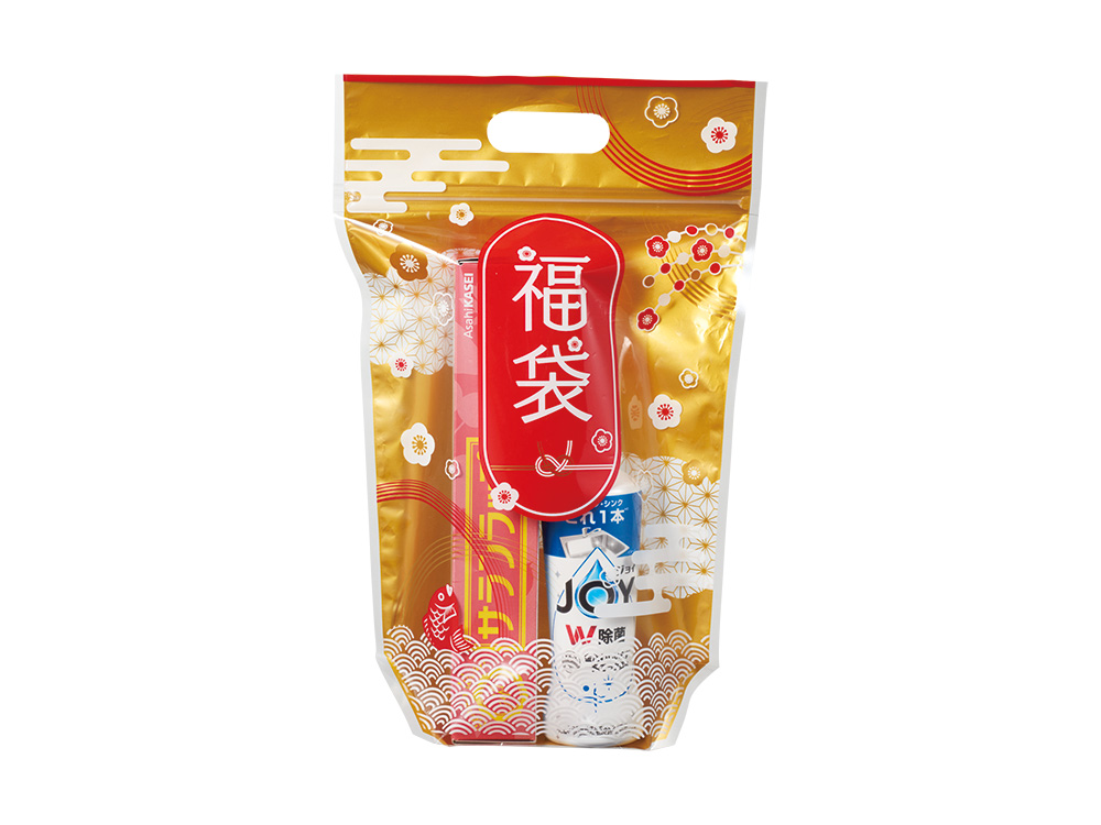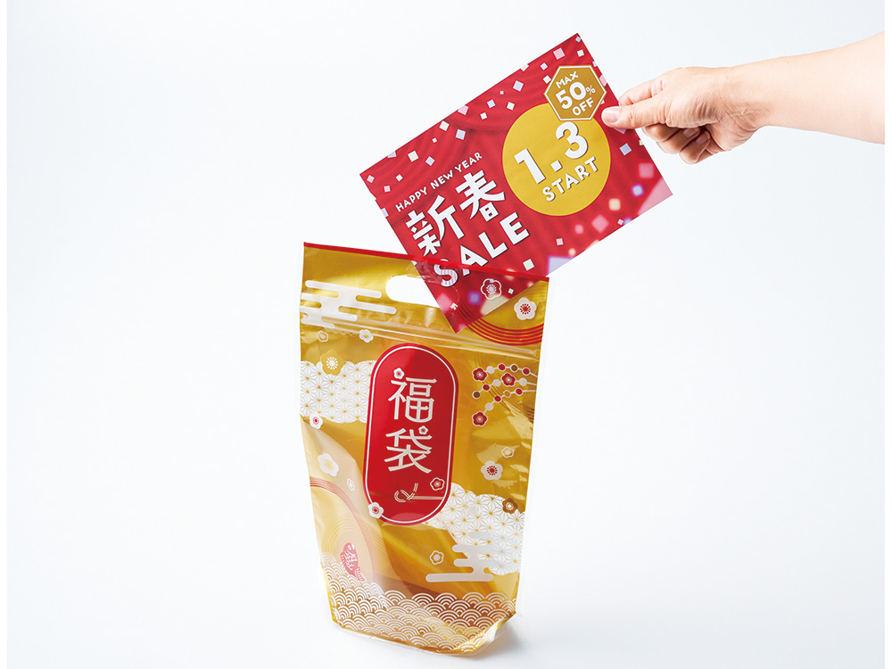 よく使うキッチン用品2点が入ったおめでたい福袋入。名刺やチラシも入れやすく、売りやブースを華やかに彩ります。マチ付きなので自立するのもポイント。
