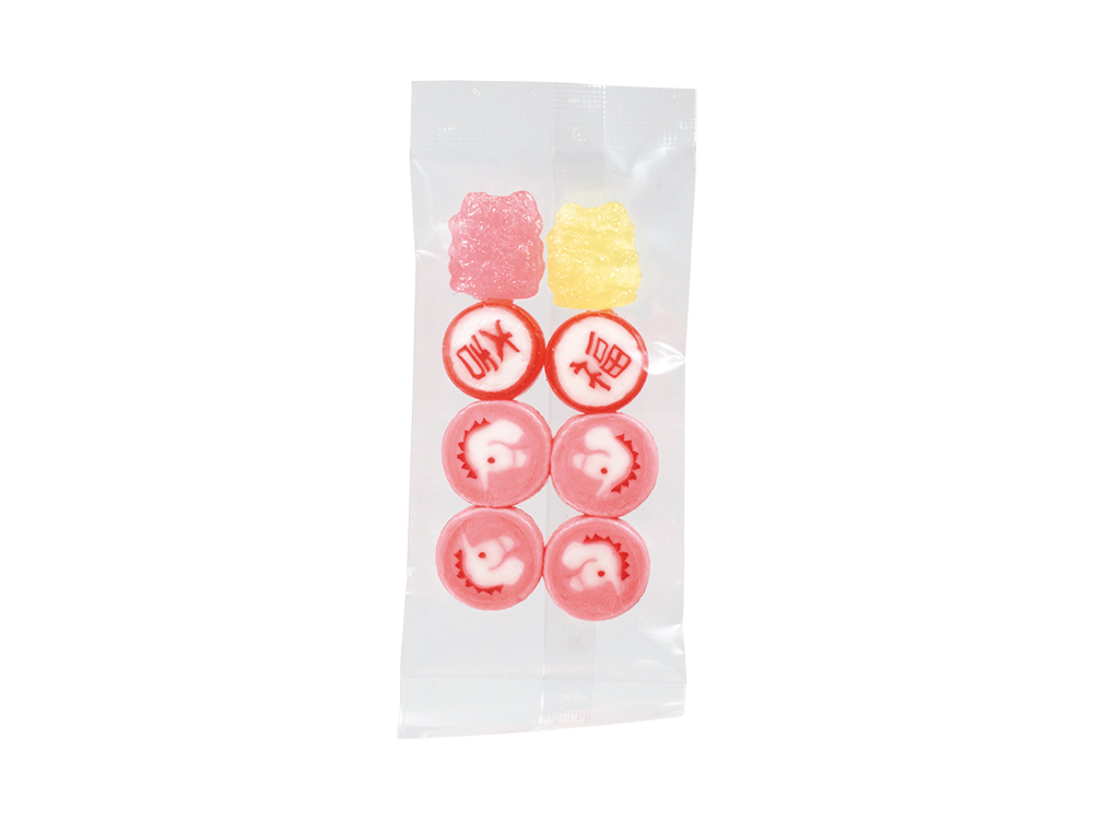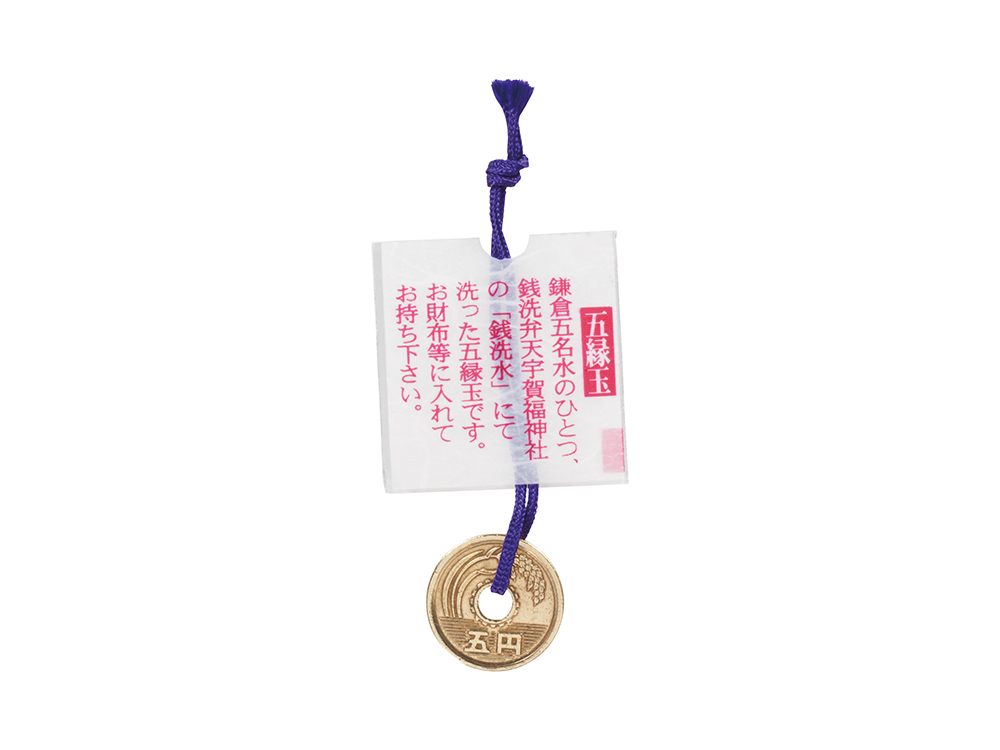 干支柄の金太郎飴と招き猫の飴をセットにしたお年賀にぴったりのキャンディです。銭洗弁天でお清めした5円玉の根付付きです。