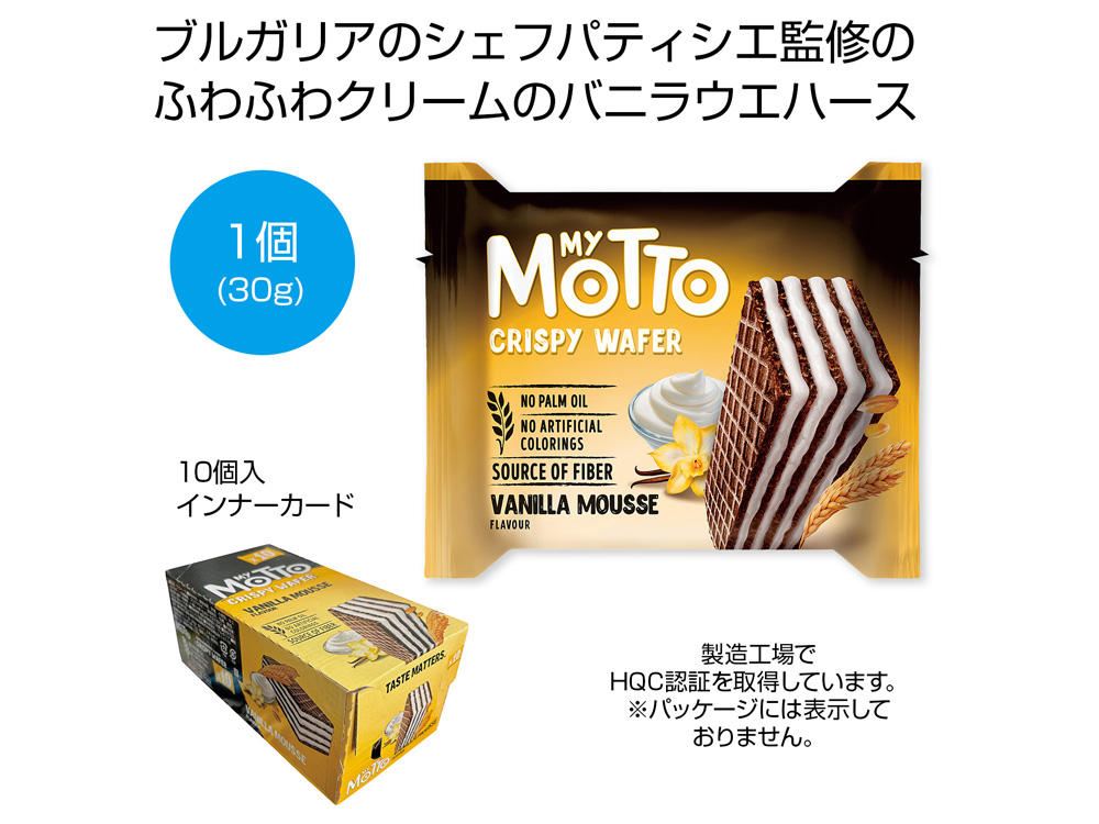 ②バニラムース:ブルガリアのサクサクウエハースとたっぷりふわふわクリームでとにかく美味しいウエハースです。 クリーム多めでウエハース特有のパサつきがありません。