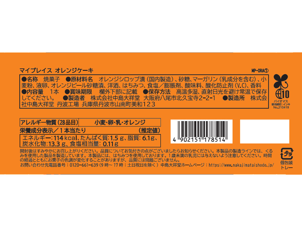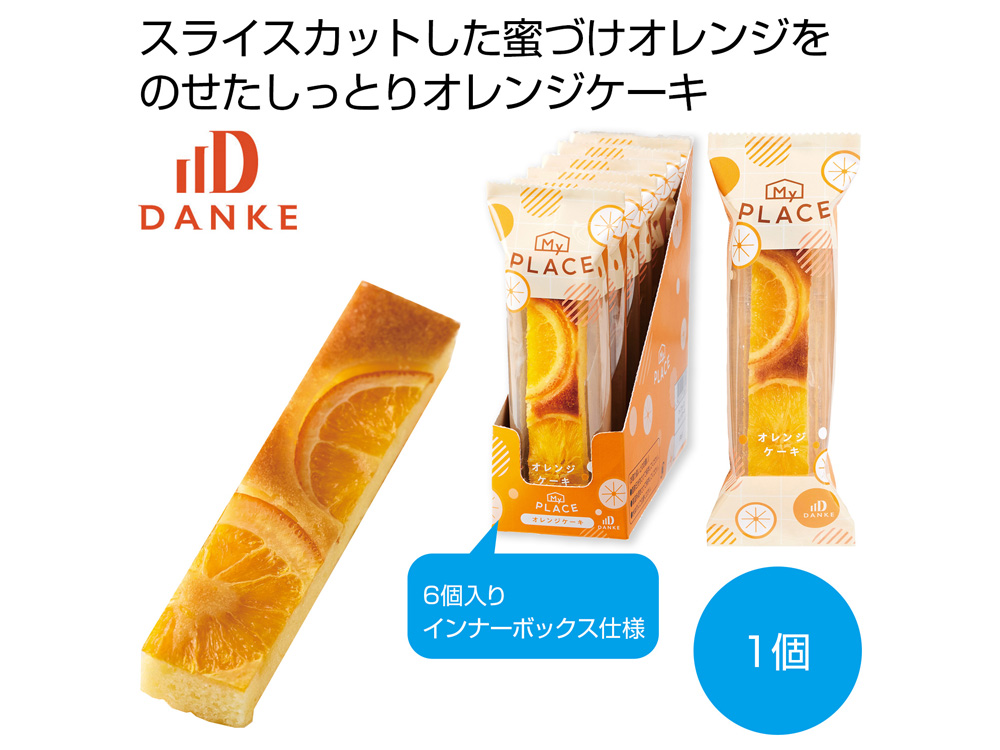 オレンジケーキ:スライスカットした密づけオレンジをのせることでさらにしっとりとしたケーキに仕上がりました。お口に入れた瞬間オレンジの香りが口いっぱいに広がります。