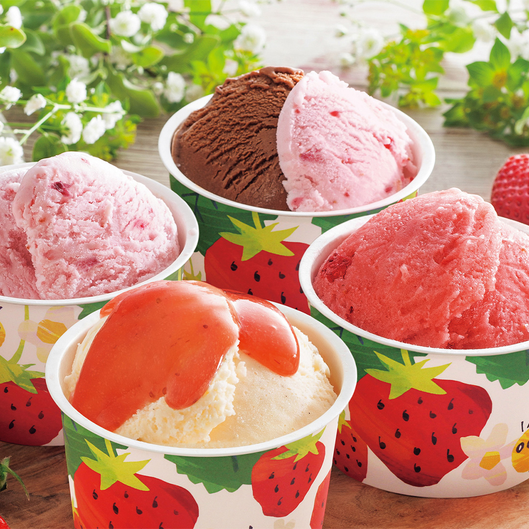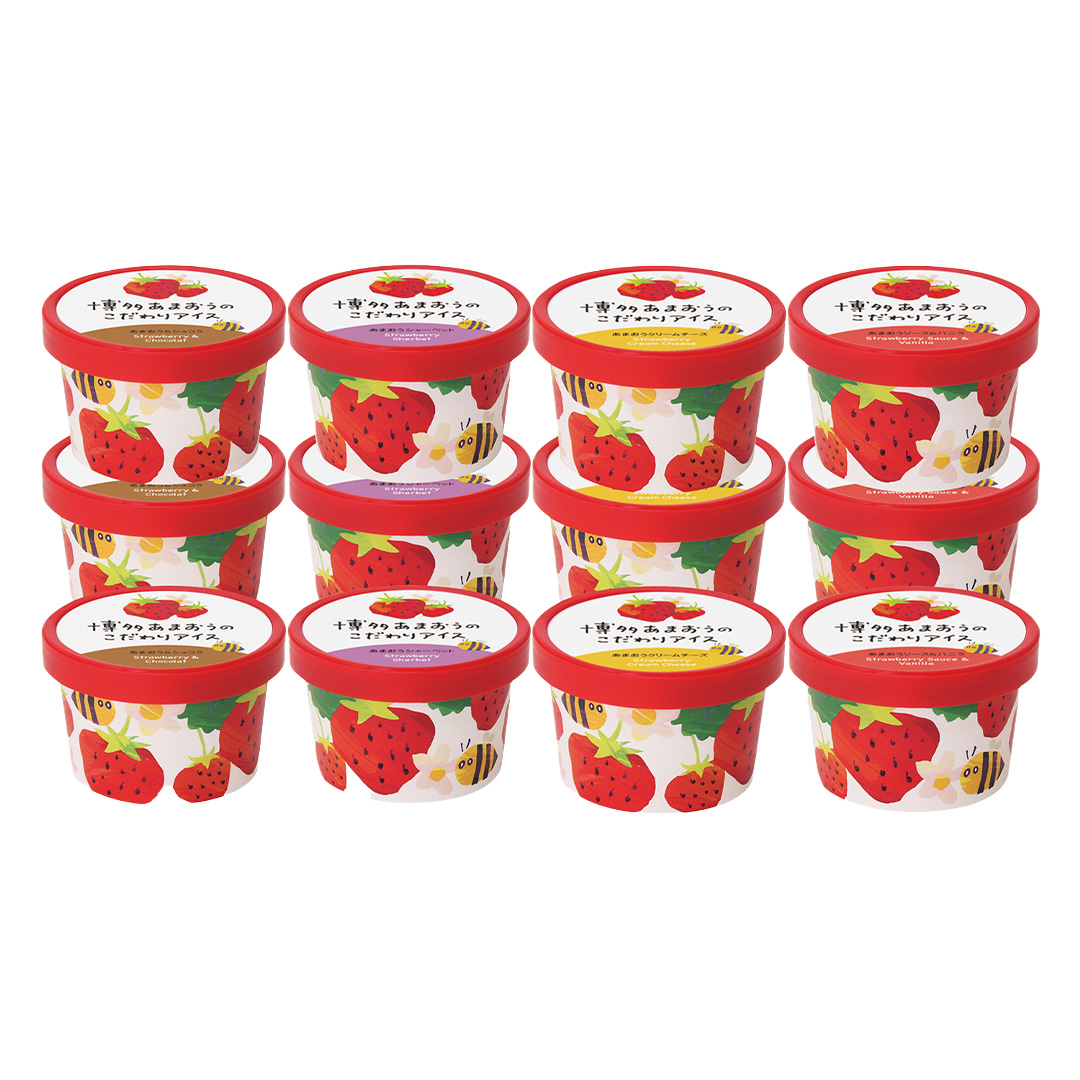 福岡の農家さんが愛情たっぷりに育てた「博多あまおう」をとことん楽しむアイスです。苺と相性のよい素材を選び、全く異なる4つの味わいに仕上げました。あまおうの魅力がぎゅっと詰まった、大人から子どもまで幅広く愛されるアイスです。