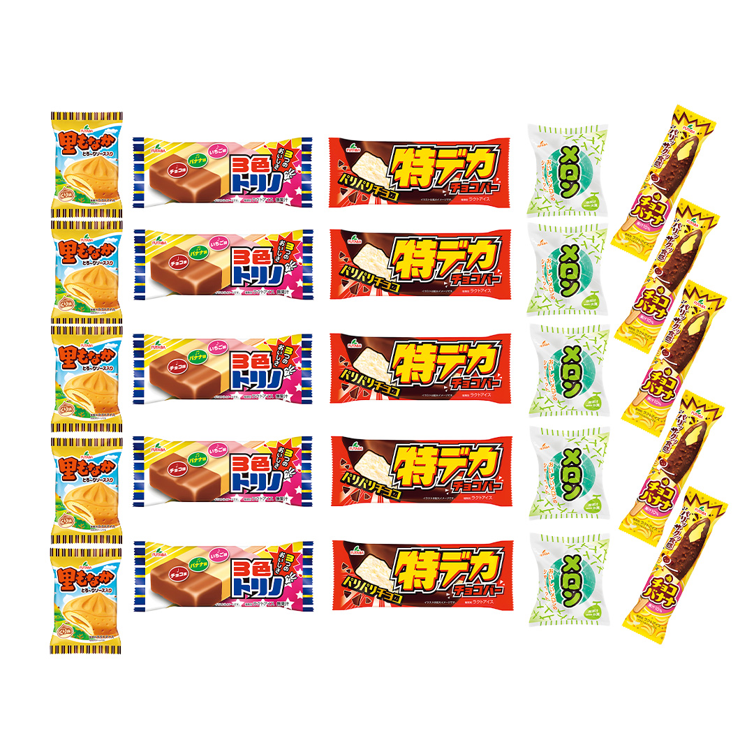 フタバ食品の中でもロングセラー商品5種をセットにしました。発売から43年目の「里もなか」をはじめ、3色トリノなど、なつかしのアイス5種類を計25本詰め合わせました。