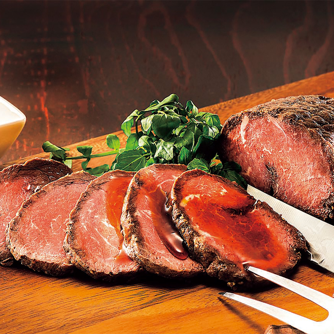 スパイスが効いた北海道産牛のローストビーフ。三國シェフ推奨のローストビーフと焼豚が味わえる贅沢セット。どちらも道産原料にこだわっています。