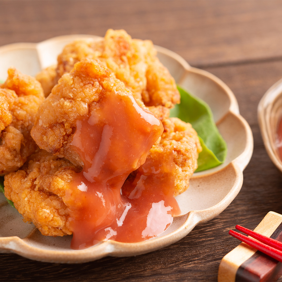 「「季旬鈴なり」村田明彦監修のレンジやトースターで簡単に食べられる調理済みからあげです。レンジやトースターで簡単に食べられる調理済みからあげに、さらに味を楽しめるよう梅ソースを付けました。揚げずに済むのが便利なからあげは、常備していると便利な逸品です。