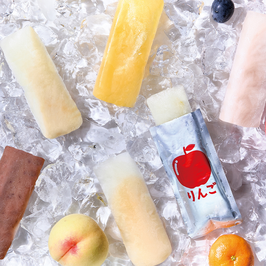 少し振ってから袋のまま凍らせて、アイスとしてお召し上がりいただけます。もちろんそのままジュースとしても。夏のおいしいおやつです。 4つの味で取混ぜ出荷が可能です。