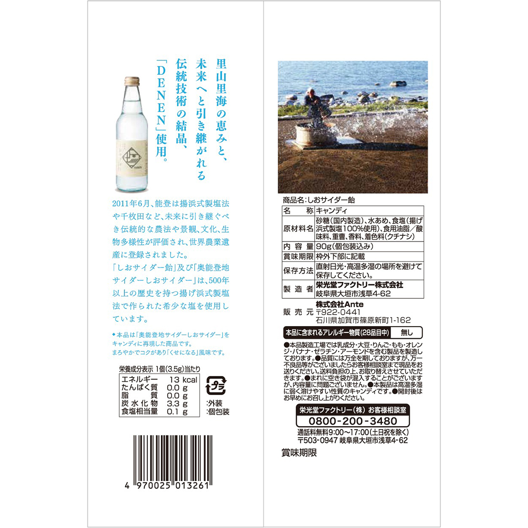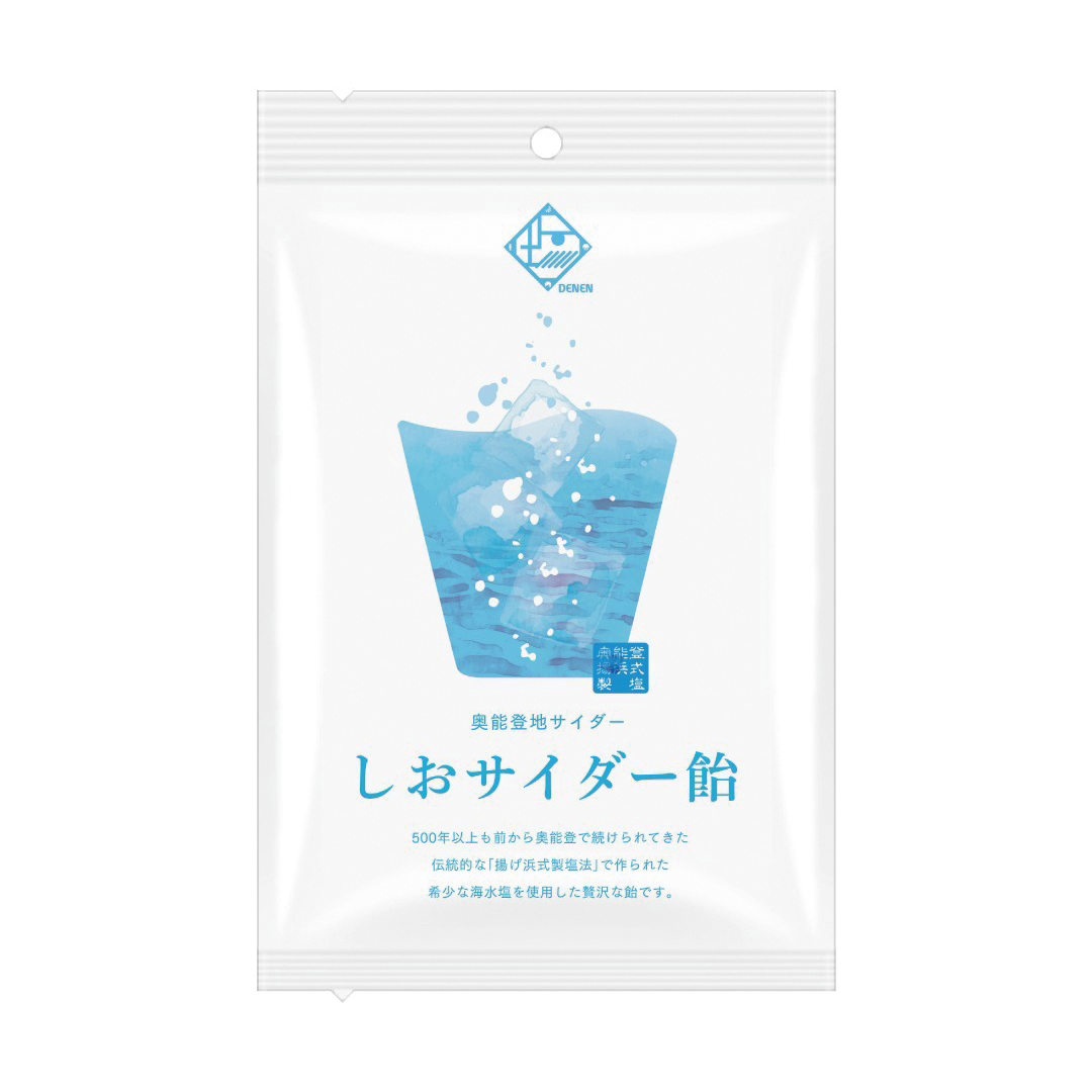 奥能登地サイダー「しおサイダー」味に仕上げた贅沢な飴です。500年以上の歴史をもつ揚げ浜式製塩法で作られた希少な塩を使用しています。まろやかでコクがあり「くせになる」風味です。