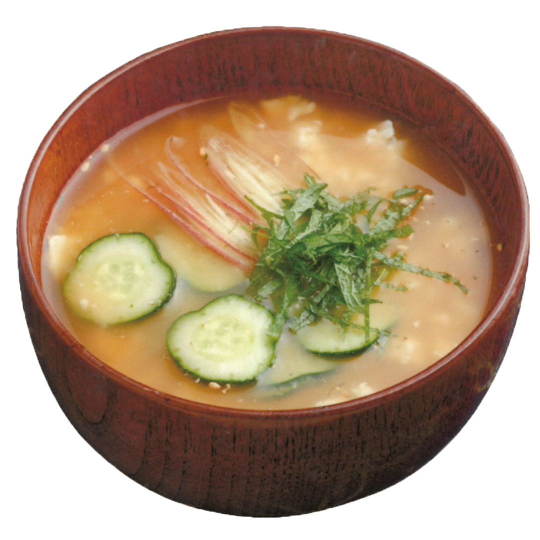 冷や汁は、焼いたあじやいわしをほぐし、焼きみそをのばした汁に、とうふ、きゅうり、大葉などの薬味をいれてアツアツのご飯にかけて食べる夏のスタミナ料理!宮崎特産の日向夏でにさっぱりとした味わいに仕上げました。