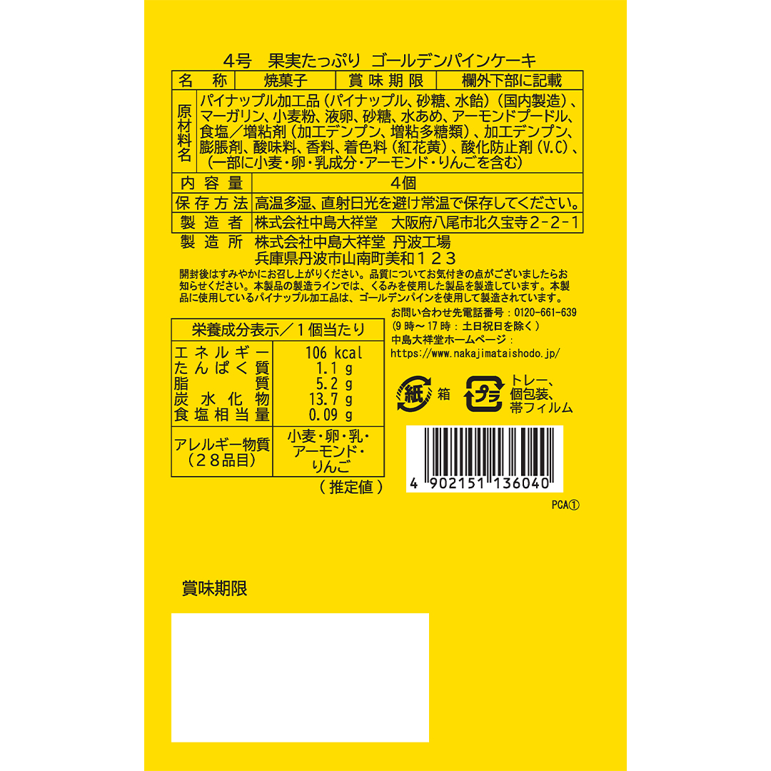 | 商品 | ひととえ 果実たっぷりゴールデンパインケーキ 4個 |