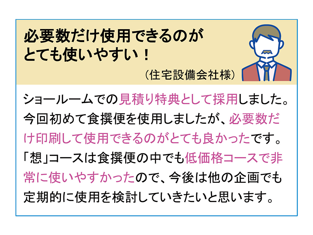 ご自分用に購入してもよし、友達や身内にプレゼントしてもよし。どなたでも気軽にお買い求めいただける食撰便・『想 omoi』。もっとも安価な1000円ランクで、全商品ポスト投函なので受け取りも簡単!