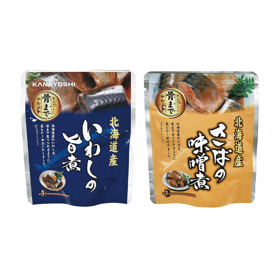 北海道産のいわしとさばを骨まで食べられるように柔らかく加工しレトルトパックにしました。常温でも食べられます。賞味期限も長いので非常食にも良いです。