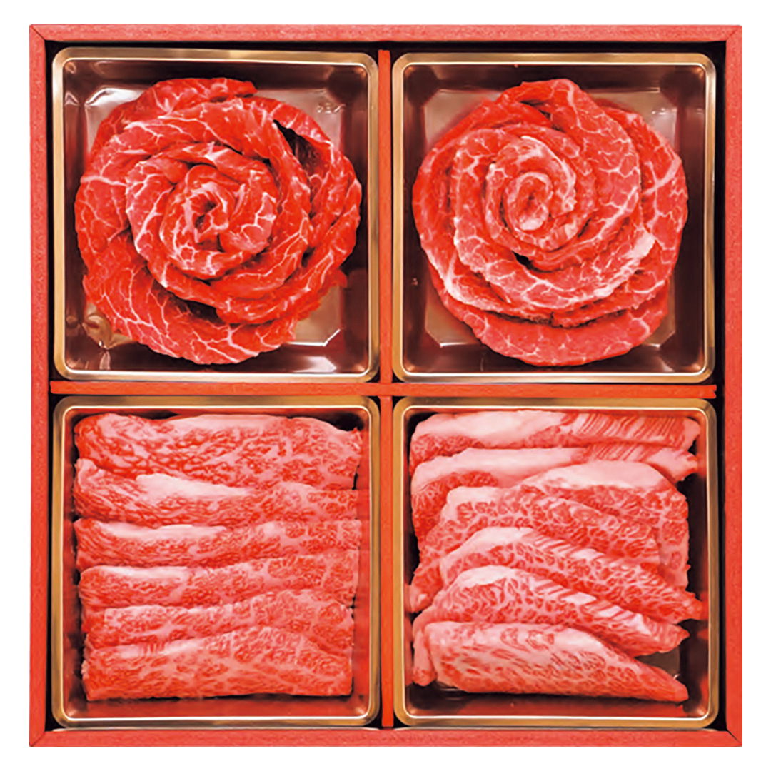見栄えのする商品を是非ご賞味ください。国産黒毛和牛の霜降り肉「肩ロース」と赤身肉「モモ」を焼肉用にカットし、華やかに盛り付けました。