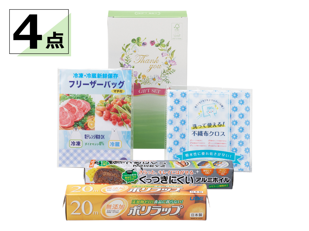 「トートバッグギフト ペーパーセット」は、エコマーク認定のコットントートに入ったうれしい生活消耗品のセットです。ティッシュやキッチンペーパーなどの紙類が同梱されており、まとめて透明袋に入っているのでセットは簡単! 抽選会などのイベントですぐに準備できます。