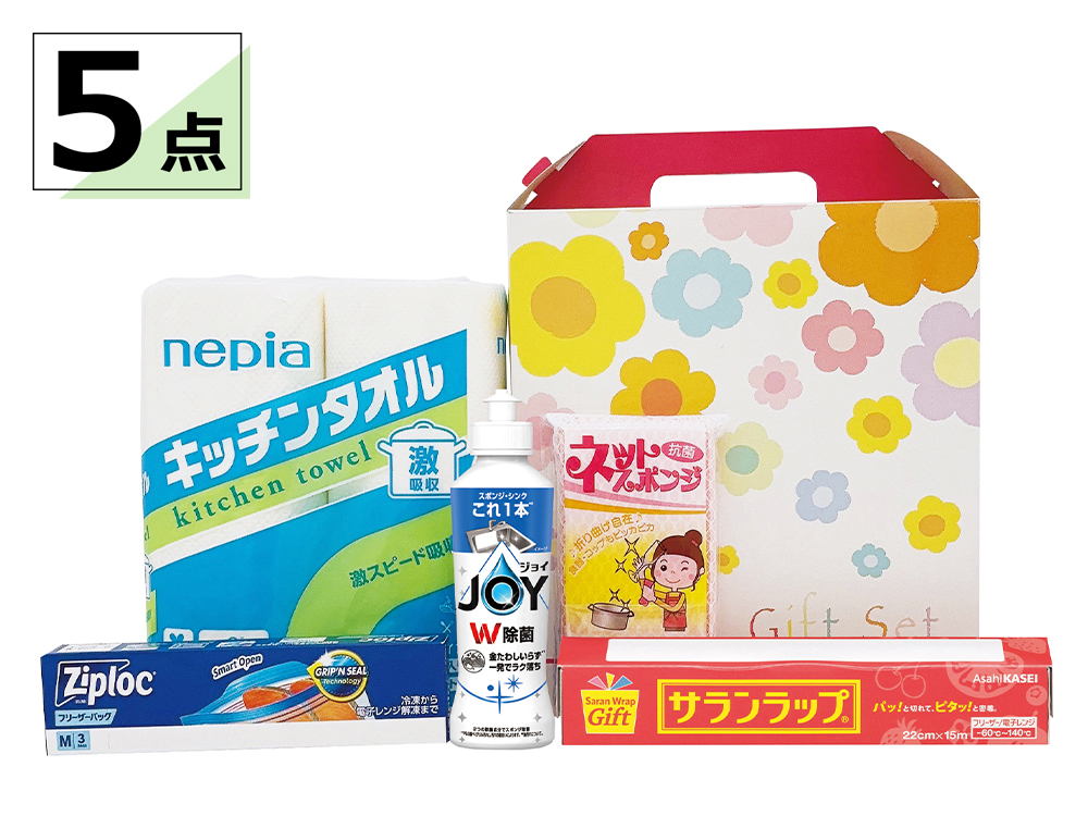 「保存に便利なキッチン4点セット」は、ポリラップやアルミホイル、フリーザーバッグなどの食品を保存しておくのに適したアイテムを詰めたギフトセットです。毎日のように使うキッチンの消耗品なので、多くの方のお役に立てるはず。