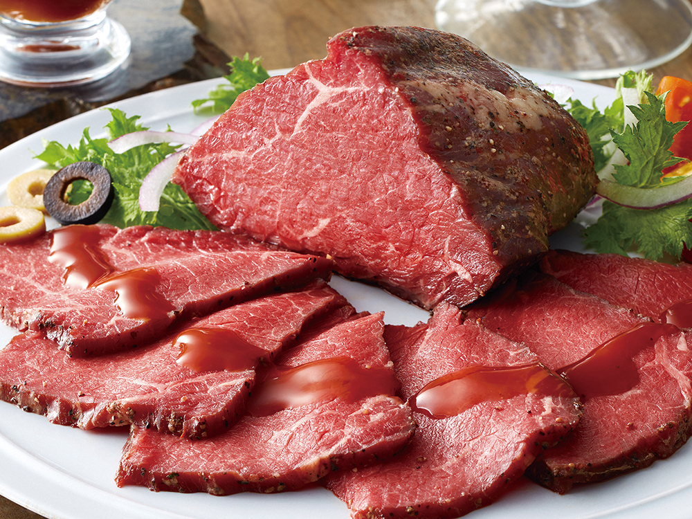 スパイスで味付けした牛もも肉を丁寧に調理し、肉の旨みを閉じ込めました。2~3ミリの厚さにスライスして、大宮シェフ特製のグレイビーソースでお召し上がりください。