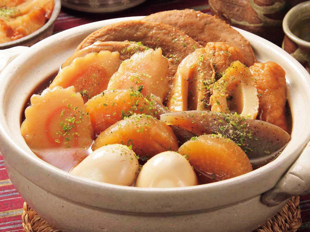かつおベースのだしで、静岡名物の「黒はんぺん」や「なると」などの練り物をじっくりと煮込んだ静岡おでん。