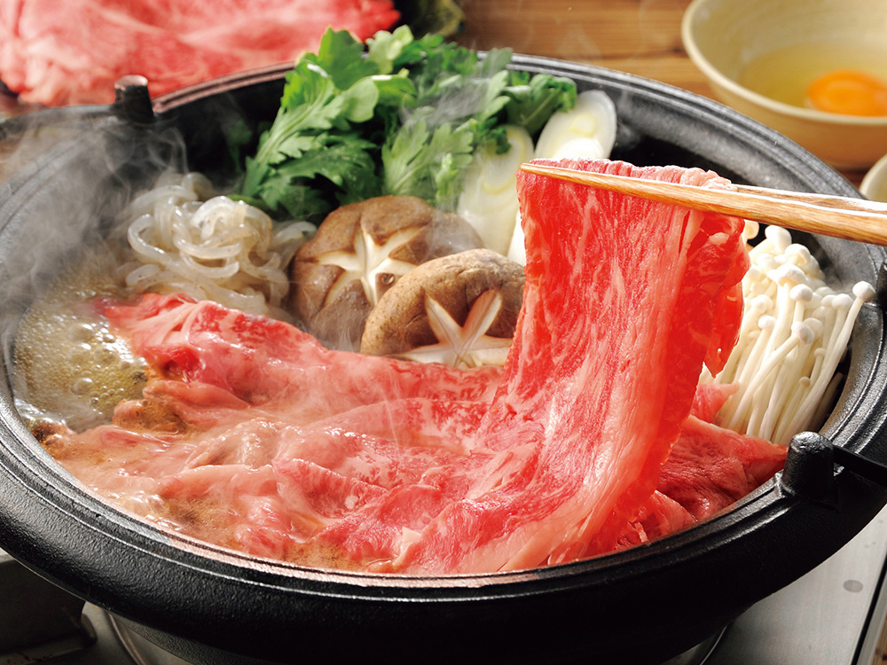 岡山県の名産「備前牛」を使ったすきやき。肉のくせや臭みがなく、ジューシーで美味しく、食べやすい牛肉として評価を得ています。
