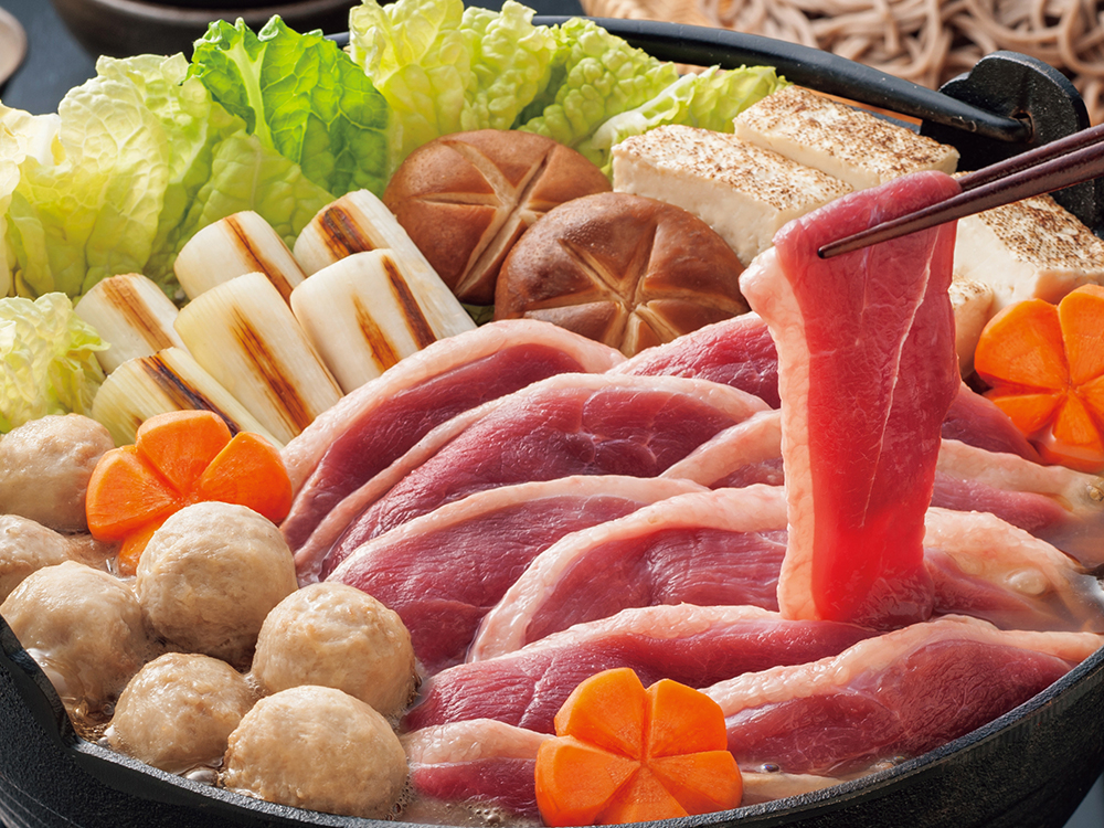 合鴨ロースとつくね、鴨だし、五割そばがセットになった鴨鍋です。お好みで野菜や豆腐などを加えてお楽しみください。使いやすい2人前ずつに分けてお届けします。
