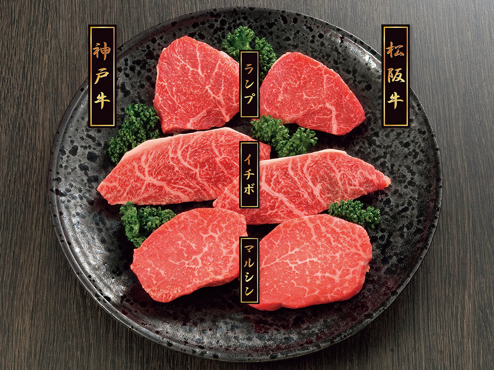贅沢な食べ比べをお楽しみください。松阪牛と神戸牛の赤身肉の希少部位(ランプ・イチボ・マルシン)をステーキ用に職人が手切りしました。