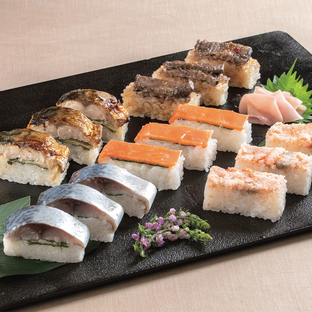 福井の食材と食文化を詰め込んだ「贅沢寿司セット」。紅ずわい蟹のほのかな潮の香りと甘み、焼き鯖や〆鯖の旨み、若狭牛やふくいサーモンの贅沢な味わいを押し寿司で楽しめます。酢飯には契約農家が育てた福井県特別栽培米コシヒカリを使用。出来たてを急速冷凍で新鮮な美味しさをお届けします。